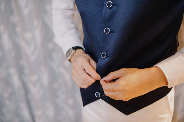 着用方法は、ベストの一番下のボタンを外し、シャツとベルトの隙間が見えないように調整するのが基本。ジャケットは立っているときは留め、座る際は外すとスマートですよ。