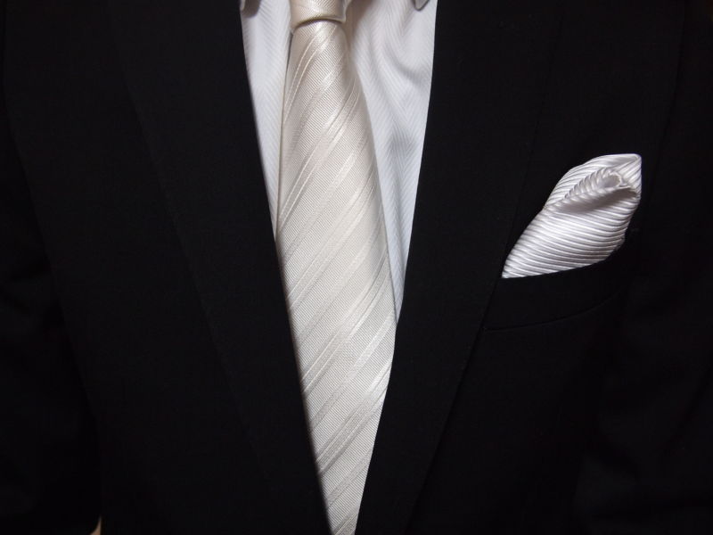 小物で印象を切り替えるには、慶事は白シャツにシルバータイと白チーフ、弔事は黒タイ・チーフなし・黒のプレーントゥシューズをあわせるといいでしょう。