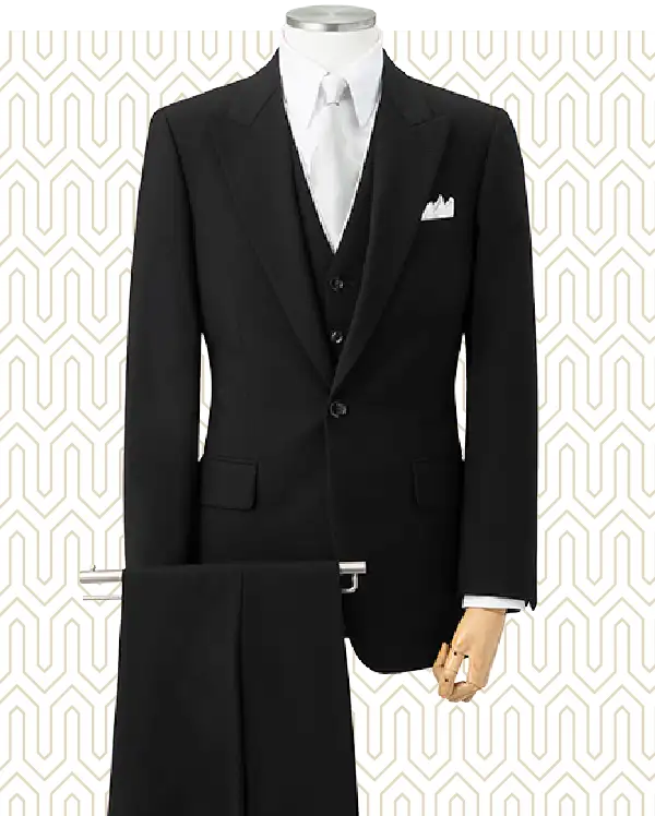 礼服のジャケットは、装飾を抑えたシングル2ボタン・ノッチドラペル・ノーベント(またはセンターベント)・両玉縁ポケット・黒調ボタンが基本です。